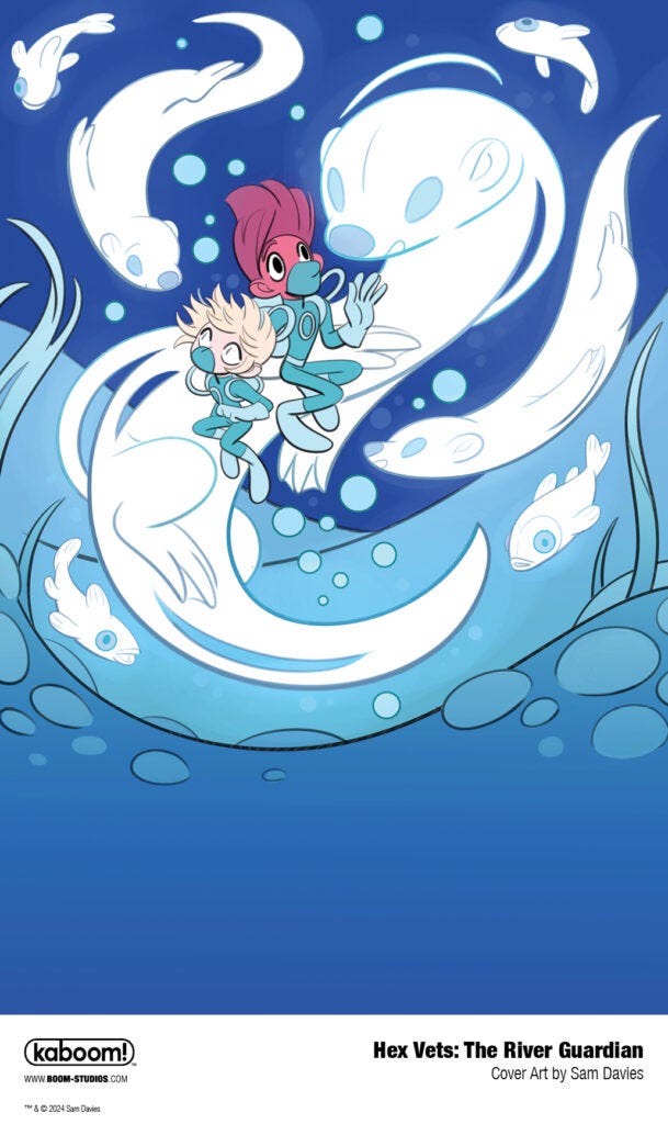 Over that past several months, Lisa has been working with creator and illustrator Sam Davies (Stutterhug) on a graphic novel for BOOM! Studios. It’s called Hex Vets: The River Guardian and it just released this week in shops!